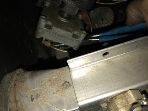 5. Use an AC test cord to power the auger motor and rotate the shaft so that the set screw or bolt on the auger collar can be accessed easily from inside the stove. You may simply plug the test cord on the male clips on the electromagnet on the back of the gearbox. The picture below depicts an Allen wrench in position to unscrew a set screw.