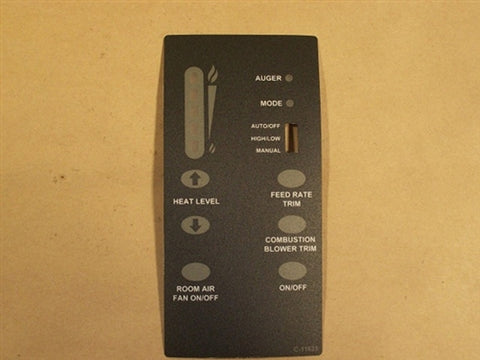 Decal ONLY for Enviro Circuit Board. Part # 50-1930. For Enviro Control Panel 50-1929. This decal has a vertically positioned On/Off/Thermostat slide switch, check T-Stat switch position on board before ordering. If the control board in your stove does not have a fan button, horizontal On/Off/Thermostat slide switch, or no T-Stat switch at all, this is NOT the correct decal.